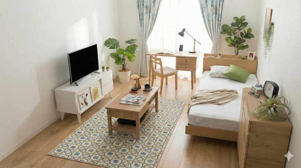 ベッドやテーブルまでの動線がスムーズだと、部屋での生活が快適になります。家具を置きすぎないこともポイントです。
