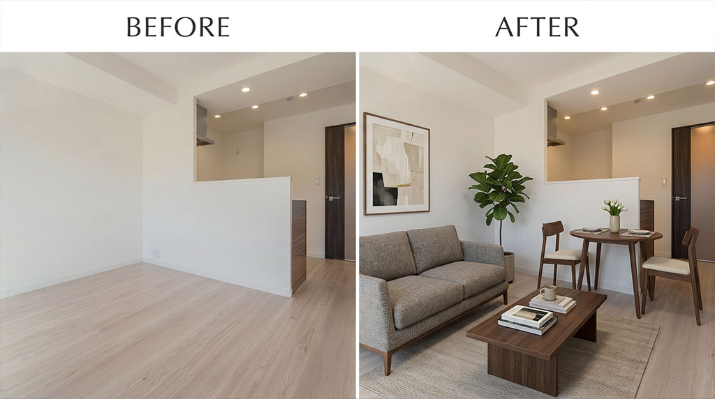 退去を待たずに次の入居者への広告活動を始めたい場合、AIの「家具消し」機能が有効です。現在の入居者の家具を写真から除去し、空室状態のイメージを作成。そのままバーチャルステージングを施すことで、退去前でも新しい生活イメージを訴求した広告が可能になります。スケジュール調整の手間が大幅に減り、空室期間の短縮にも貢献します。